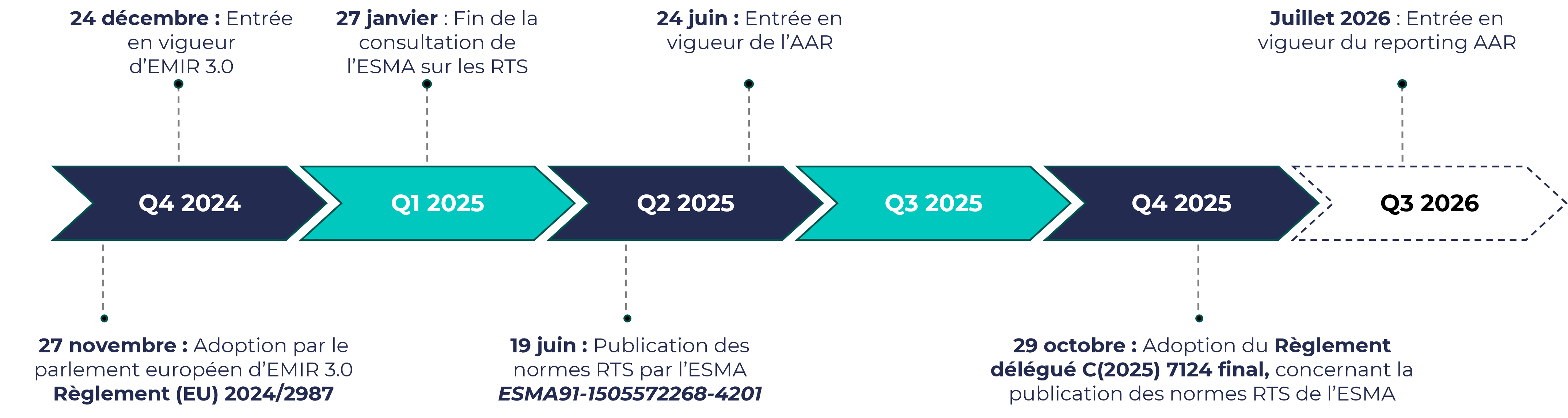 Cette mesure phare d’EMIR 3.0 est entrée en vigueur le 24 juin 2025. Dans son rapport final publié le 19 juin 2025 (2), l’ESMA vient préciser les exigences réglementaires attendues sur les principaux changements introduits par EMIR 3.0, dont l’AAR et les obligations de reporting qui en découlent.